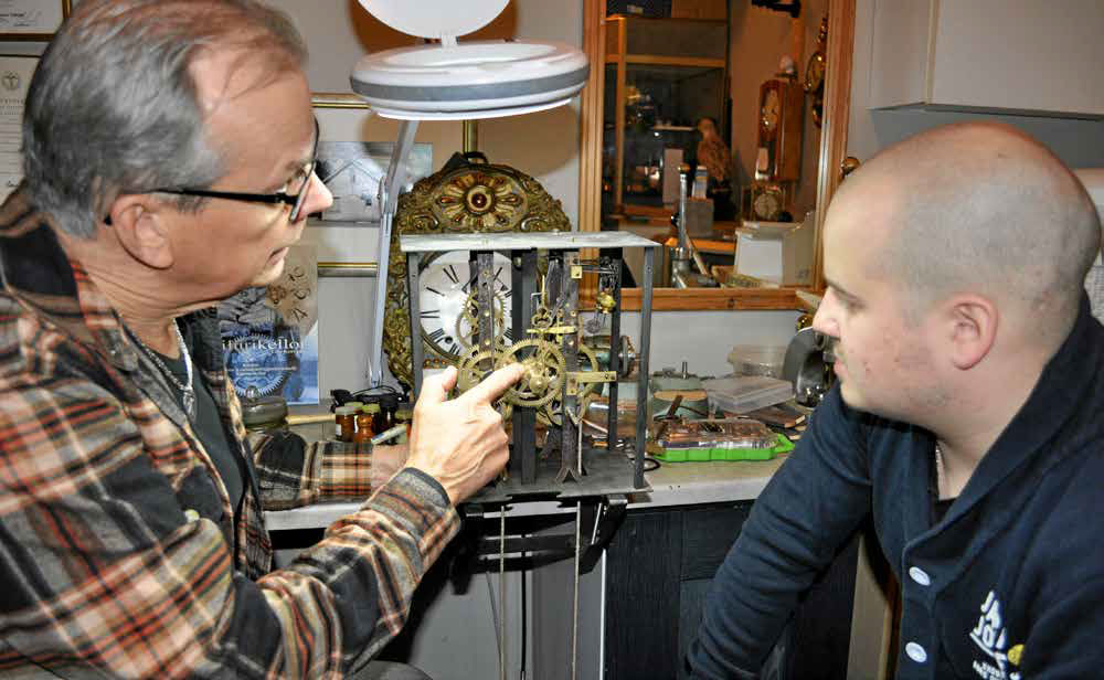 Kellosepät Erkki ja Petteri Jyrkkänen tutkivat 1800-luvun seinäkelloa, joka on tullut huoltoon